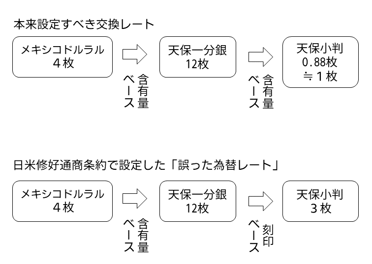 含有量ベースではメキシコドルラル4枚で天保小判1枚のところ、為替レートを誤ったために
