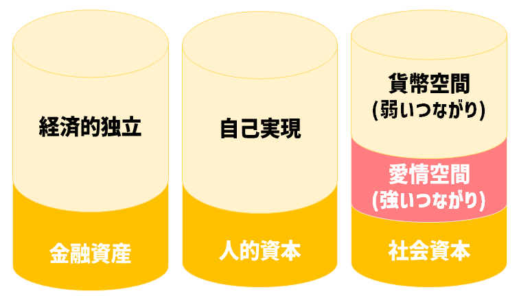 - 社会資本は小さな愛情空間と大きな貨幣空間に分散する